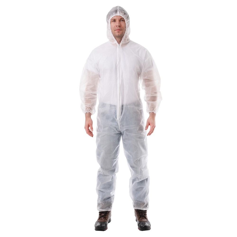 Комбинезон одноразовый изготовлен из нетканого безворсового материала «cпанбонд» плотностью 40 г/кв.м. Материал нетоксичен, не вызывает аллергических реакций, антистатичен, имеет хорошую воздухопроницаемость одновременно с пылезащитными свойствами. Центральная застежка на молнию.
