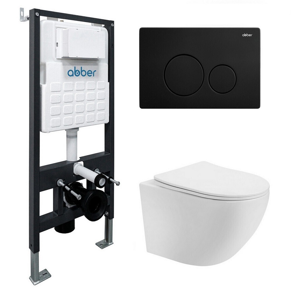 Комплект Abber 3 в 1. В комплекте есть все необходимое для быстрого монтажа. Состоит из подвесного керамического унитаза со смывом торнадо, сиденья для унитаза из дюропласта с микролифтом, инсталляции AC0105, кнопки смыва из нержавеющей стали.