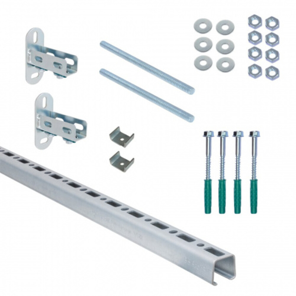 Комплектация: Держатель профиля — 2 шт., профиль RapidRail 30х30х2 — 1 м.п., шпилька резьбовая М10х120 — 2 шт., шайба U-образная 10,5/30,5 — 2 шт., винт-шуруп 8х60 — 4 шт., шайба 10 — 6 шт., шестигранная гайка — 8 шт., универсальный дюбель 10х50 — 4 шт.