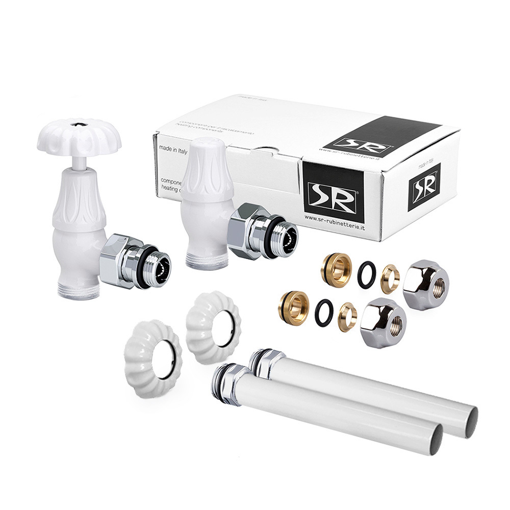 Комплект угловых вентилей SR Rubinetterie серия Floral Old Style, соединения для медных и многослойных труб. Трубки, изготовленные из латуни, имеют декоративные отражатели, которые по дизайну сочетаются с клапанами радиатора.