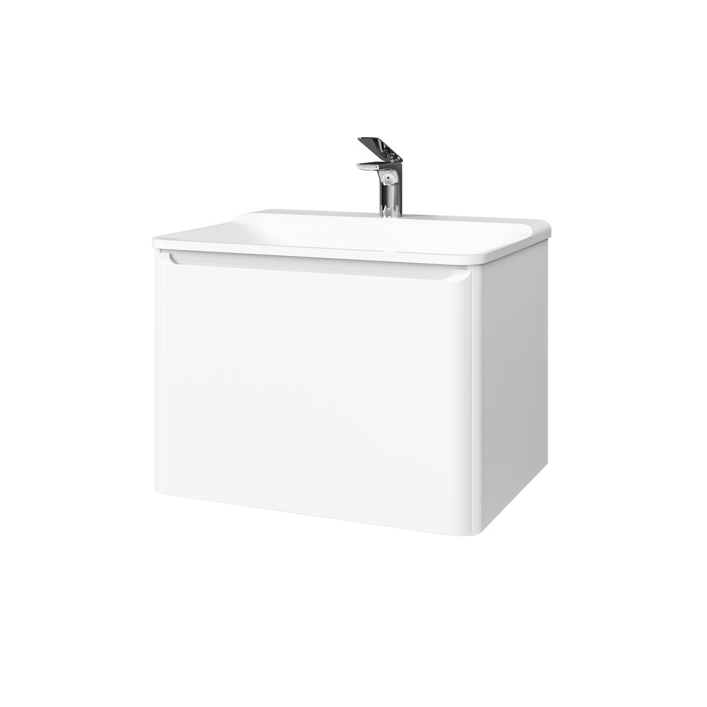 Тумба с раковиной из коллекции Welto бренда Raval — это сочетание практичности и минималистичного дизайна. Компактный выдвижной ящик освобождает пространство под тумбой для дополнительного использования. Плавное скругление углов и интегрированные ручки делают комплект максимально безопасным. Полноразмерная вкладная раковина из литьевого мрамора проста в уходе и устойчива к загрязнениям. Фасады тумбы изготовлены из МДФ и покрыты глянцевой пленкой ПВХ.