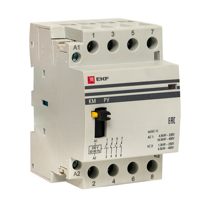 Представляет из себя контактор в классическом корпусе модульного оборудования. Он состоит из неподвижных контактов, подвижных контактов, которые закреплены в подвижной части магнитной системы. Неподвижная часть магнитной системы закреплена жестко в корпусе КМ. Пружина препятствует смыканию контактов. При подаче напряжения на катушку управления в магнитной системе контактора возникает магнитное поле, которое, преодолевая сопротивление пружины, смыкает магнитную систему и замыкает контакты. При отключении напряжения с катушки управления пружина размыкает контакты. Возможна коммутация алюминиевым и медным проводом.