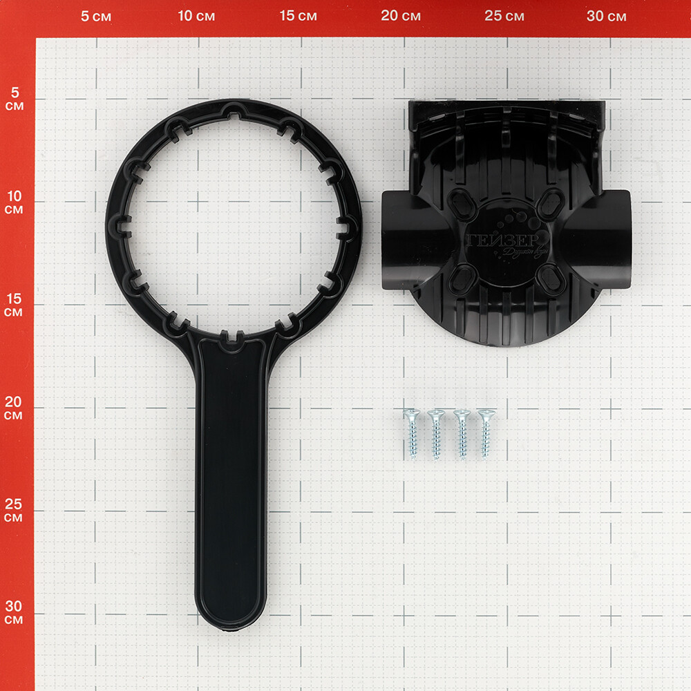Корпус фильтра, крышка, Пластиковая скоба (кронштейн), уплотнительное кольцо, ключ для корпуса, Саморезы – 4 шт., инструкция, упаковка.