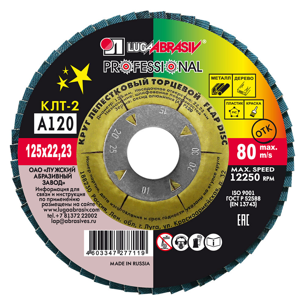 Круг лепестковый по металлу/древесине Луга Professional 125х22,2 мм P120 торцевой