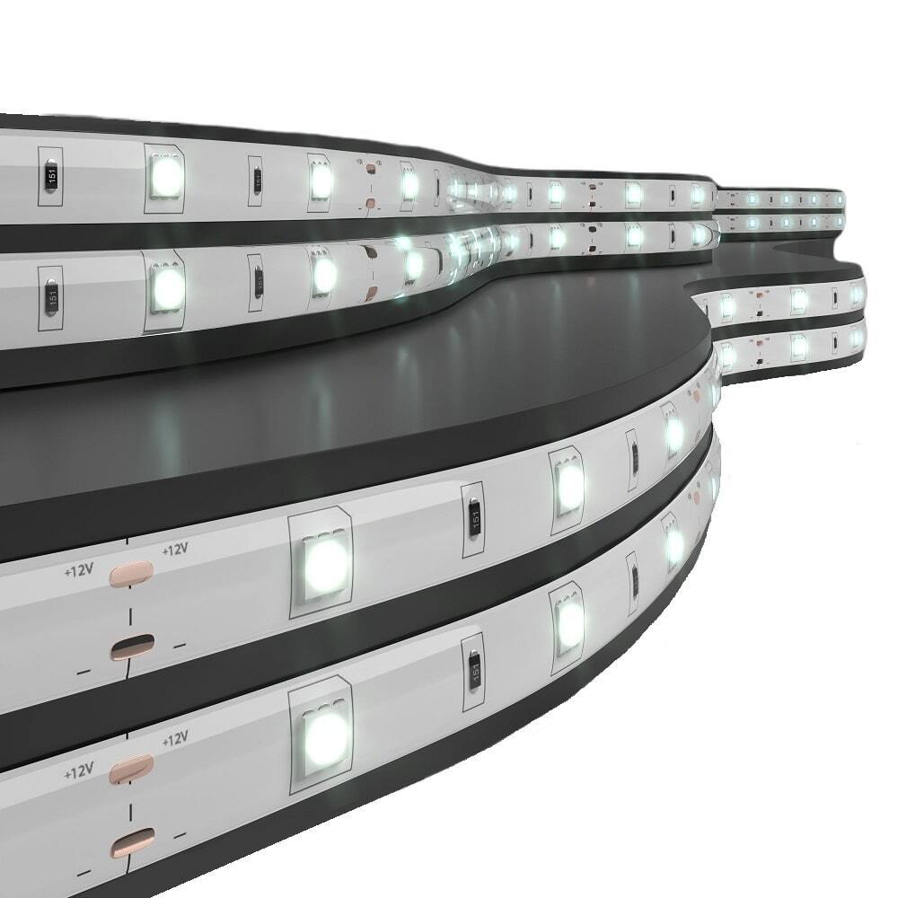 Светодиодная лента 12 В используется для декоративно-интерьерной подсветки в помещениях с повышенной влажностью (кухни, ванные комнаты), а также на улице для установки под навесом, оформления рекламных вывесок, для создания световых композиций в современных интерьерах и экстерьерах. Лента поставляется в рулоне с припаянным выводом проводов с цветовым обозначением для удобного подключения. Длина ленты составляет 5 м. Светодиодную ленту можно укоротить, отрезав нужную часть в местах для реза, а при необходимости удлинить, используя коннекторы. Гибкость ленты и надежная клеевая основа позволяют устанавливать ленту на различные поверхности. Для подключения светодиодной ленты к сети питания используются понижающие трансформаторы, преобразующие 220 В переменного тока в 12 В постоянного тока (AC 220 — DC 12V). Светодиодная лента устойчива к негативному воздействию окружающей среды и может стабильно работать в широком температурном диапазоне от -25 до +55 C. Срок службы светодиодов составляет 50000 часов.