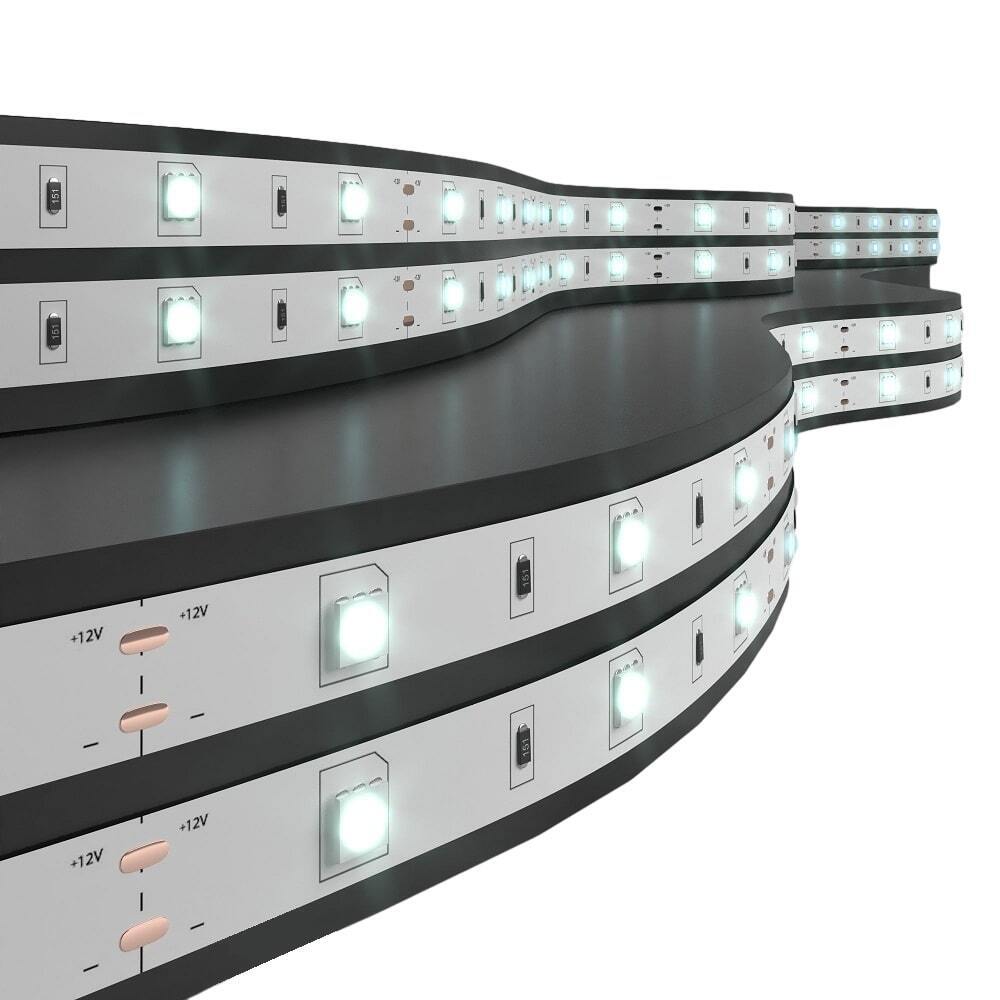 Светодиодная лента 12 В предназначена для декоративного и функционального освещения интерьеров, подсветки зеркал и предметов мебели. Лента поставляется в рулоне с припаянным выводом проводов с цветовым обозначением для удобного подключения. Длина ленты составляет 5 м. Светодиодную ленту можно укоротить, отрезав нужную часть в местах для реза, а при необходимости удлинить, используя коннекторы. Гибкость ленты и надежная клеевая основа позволяют устанавливать ленту на различные поверхности. Для подключения светодиодной ленты к сети питания используются понижающие трансформаторы, преобразующие 220 В переменного тока в 12 В постоянного тока (AC 220 — DC 12V) Широкий диапазон температуры окружающей среды позволяет использовать ленту в неотапливаемых помещениях при температуре до -25°С. Срок службы светодиодов составляет 50000 часов.