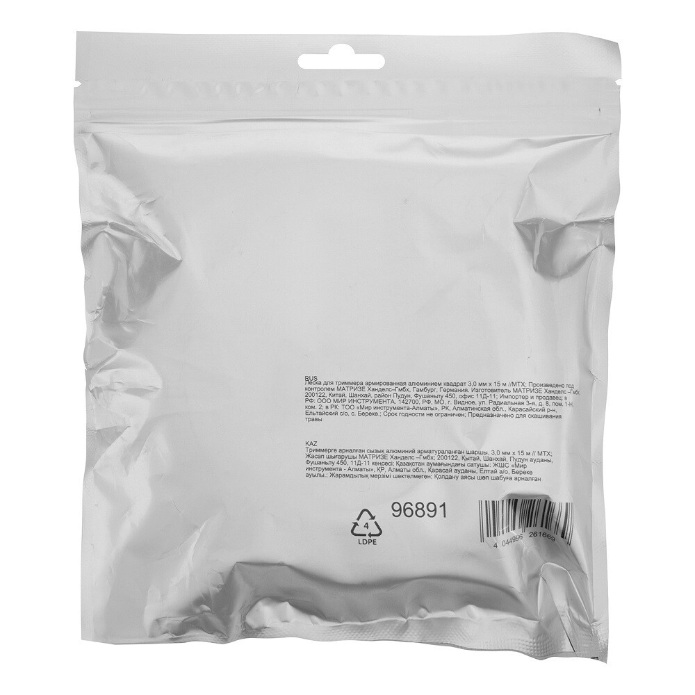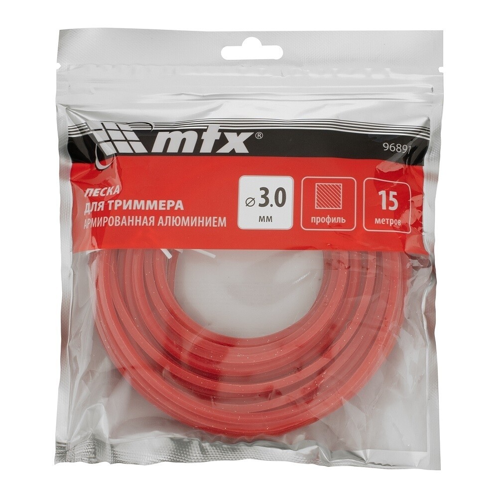 Леска для триммера MTX с сечением «квадрат», толщиной 3 мм и длиной 15 м, армированная алюминием, эффективно срезает как газонную, так и высокую, жесткую или сухую траву.