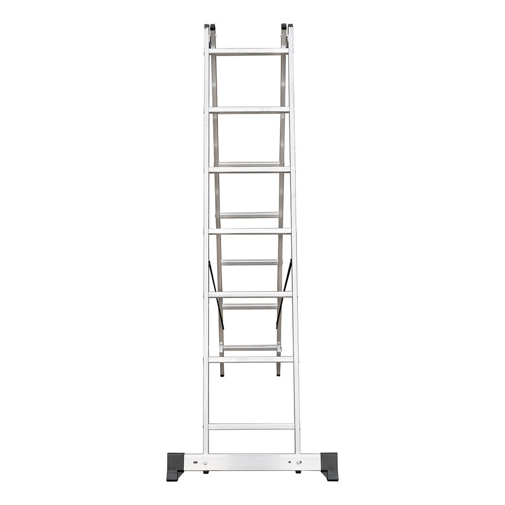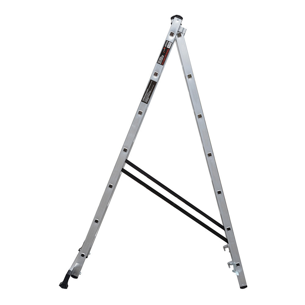 Предназначена для бытового использования. Лестница 2-секционная, в каждой секции 7 ступеней. Может использоваться как приставная лестница, раздвижная лестница и отдельно стоящая стремянка. Лестница оснащена двумя зацепами и автоматическим фиксатором секции на нужном шаге. Широкая опорная траверса стабилизирует конструкцию, а рифленые перекладины 23х23 мм обеспечивают надежное сцепление. Вальцовочное крепление перекладин по прочности не уступает сварке. Кронштейны соединяют и направляют секции, а страховочные погодоустойчивые ремни на заклепках с увеличенной шляпкой создают жесткую конструкцию, не гниют и не выгорают. Башмаки траверсы из прочного пластика не скользят и не повреждают поверхность.
