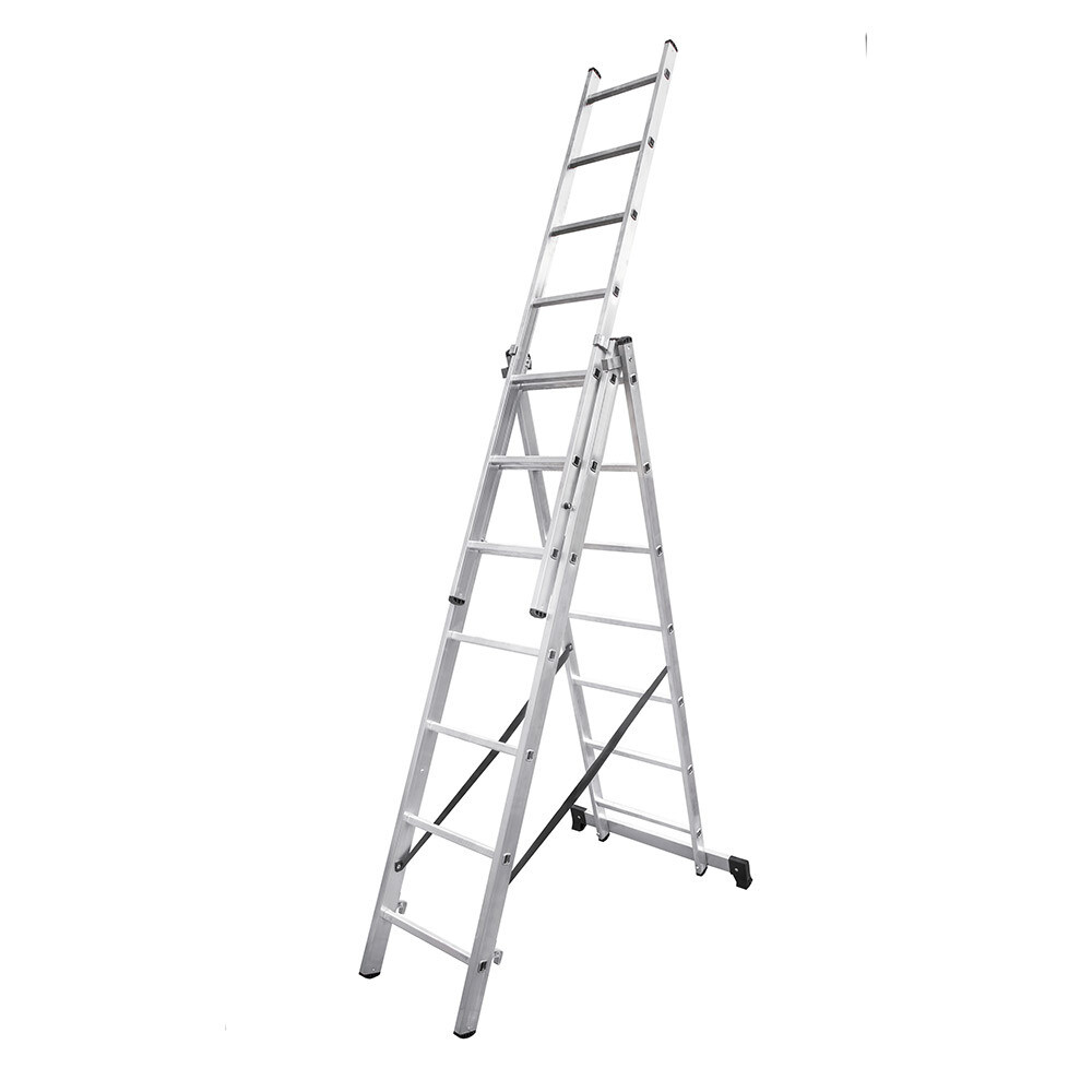 Предназначена для бытового использования. Лестница 3-секционная, в каждой секции 7 ступеней. Может быть использована как приставная лестница, раздвижная лестница, стремянка, стремянка с выдвижной секцией, дополнительная функция «лестничный марш» (установка на разноуровневой поверхности). Стойки и перекладины изготовлены из алюминиевого профиля. Рифленые перекладины имеют размер 23х23 мм для надежного сцепления. Вальцовочное крепление перекладин по прочности не уступает сварке, а широкая опорная траверса стабилизирует конструкцию. Лестница оснащена двумя зацепами и автоматическим фиксатором секции на нужном шаге. Кронштейны соединяют и направляют секции, а алюминиевая стяжка создает жесткую конструкцию и фиксирует рабочее положение. Страховочные погодоустойчивые ремни на заклепках с увеличенной шляпкой создают жесткую конструкцию, не гнию…