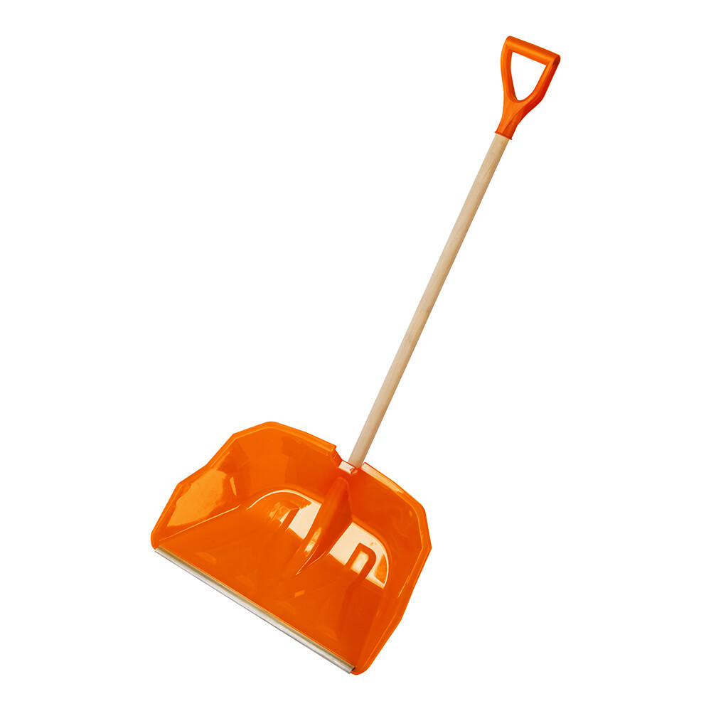 Лопата обладает высокой степенью прочности. Кромка лопаты защищена алюминиевым профилем с небольшим закруглением по краю. Это позволяет легче убирать снег в местах, где территория имеет неровности. Поверхность лопатного ковша гладкая, что значительно снижает вероятность налипания снега. Поставляется с деревянным черенком высшего сорта и V-образной ручкой.