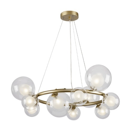 Предназначена для декоративного, интерьерного и общего освещения различных помещений. Арматура оттенка матового золота выполнена из металла, а двойные плафоны-сферы – из стекла. Внутренняя часть плафона – белого цвета, внешняя – прозрачная. Расположенные вдоль широкой окружности, они обеспечивают равномерное, яркое освещение. Визуальную легкость композиции подчеркивают тонкие, почти невидимые тросы – создается иллюзия трендового «парящего» света. Две подвесные люстры обеспечивают различную интенсивность подсветки – можно выбрать подходящий вариант (из 10 или 14 плафонов) с учетом размеров помещения. Светильники станут эффектным акцентным элементом обстановки в стиле mid-century modern, постмодерн, ар-деко, эклектика, хай-тек. Лампы в комплект не входят.