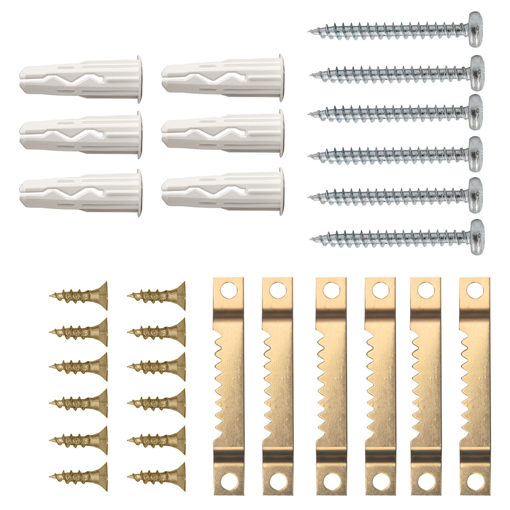 Состав комплекта: Дюбель 5×20 мм нейлон — 6 шт., Шуруп 3,5×25 мм оцинкованная сталь — 6 шт., Шуруп 3×12 мм желтопассивированная сталь — 12 шт., Зацеп зубчатый L 55 мм желтопассивированная сталь — 6 шт.