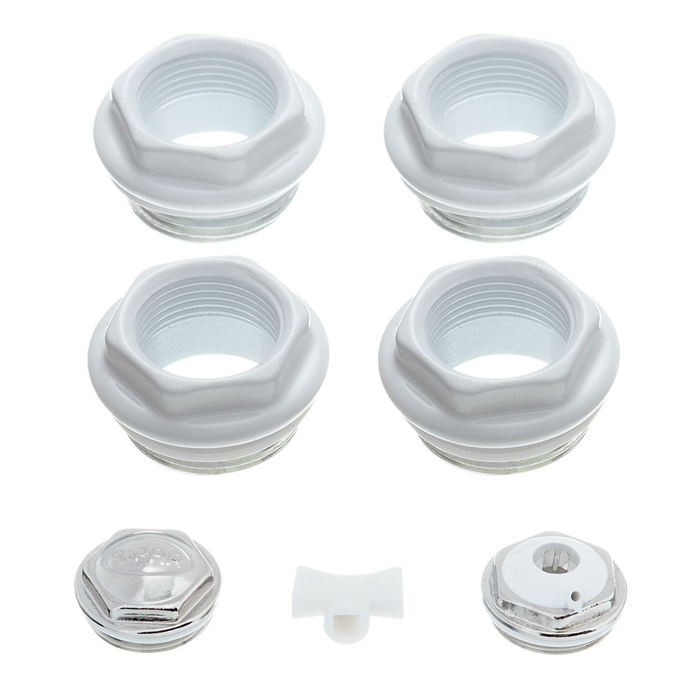Комплектация: переходник с прокладкой правый G1”- G3/4” – 2 шт., переходник с прокладкой левый G1”- G3/4” – 2 шт., заглушка G3/4” – 1 шт., воздухоспускной клапан G3/4” – 1 шт., ключ для воздухоспускного клапана – 1 шт.