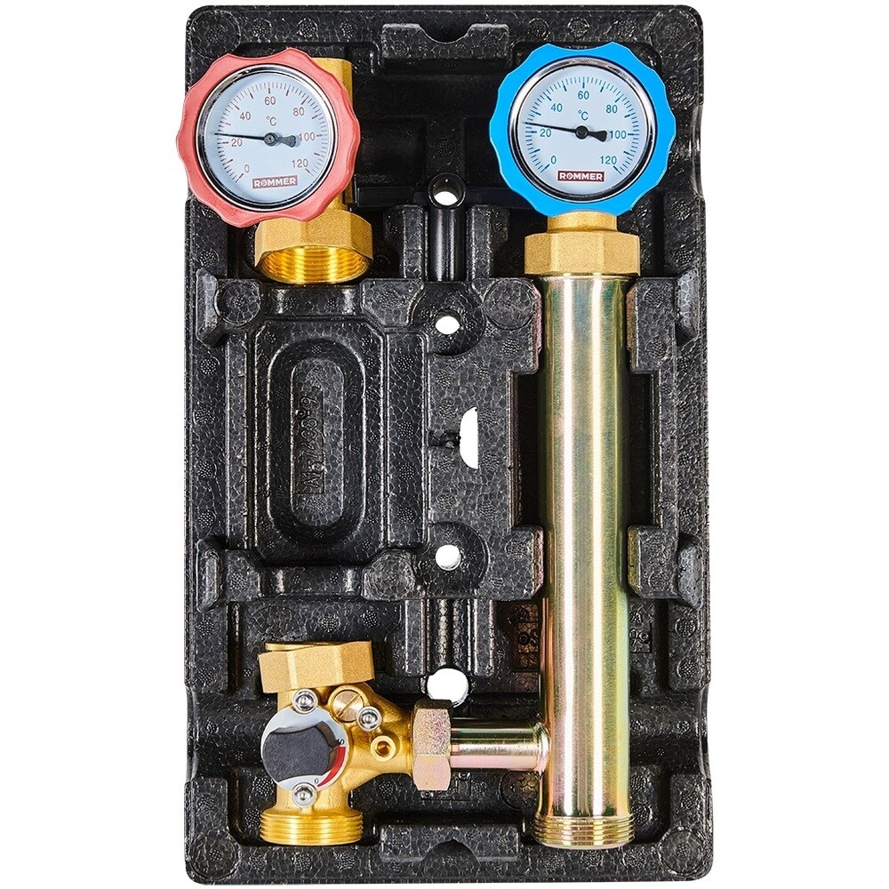 Насосная группа Rommer является элементом гидромодуля быстрого монтажа полной заводской готовности. Предназначена для обеспечения гидравлического и температурного режимов в системе отопления с переменной температурой теплоносителя. Насосная группа поставляется без насоса. Возможно использование любого насоса соответствующей строительной длиной и наружной резьбой под гайки для присоединения насоса к деталям группы. Со стороны системы теплопотребления снабжена запорными шаровыми кранами, совмещенными со стрелочными термометрами. На возвратной линии шаровой кран совмещен с обратным клапаном.