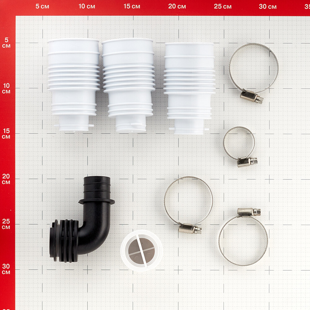 Комплектация: Оборудование в сборе — 1 шт., Инструкция по монтажу и эксплуатации — 1 шт., Колено для подключения слива (23,28,32 мм) — 1 шт., Входной патрубок d40 мм — 2 шт., Уплотнительное кольцо — 1 шт., Заглушка — 1 шт., Пластиковая гайка — 1 шт., Стальные хомуты — 3 шт.