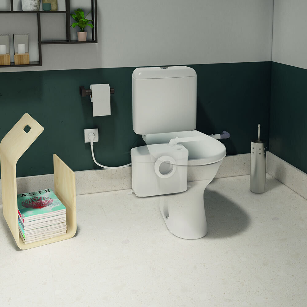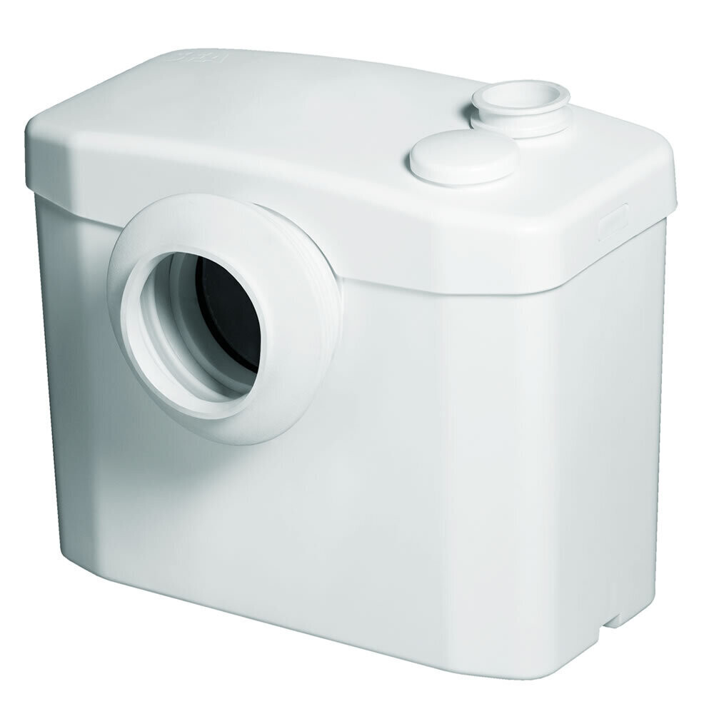 Канализационный насос Sanibroyeur, предназначенный для измельчения и отведения фекальных стоков от унитаза с горизонтальным выходом.