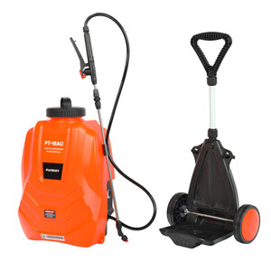 PT-18AC – аккумуляторный ранцевый садовый опрыскиватель с 16-ти литровым баком для жидкости и транспортировочной тележкой.