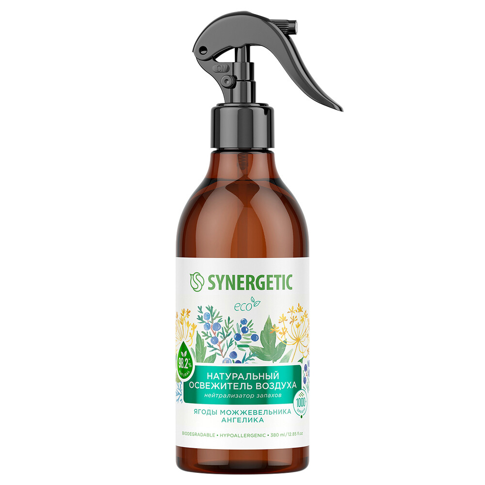 Биоразлагаемый освежитель воздуха, нейтрализатор запахов Synergetic «Ягоды можжевельника и ангелика» на водной основе — это безопасная формула с высокой концентрацией натуральных компонентов. Парфюмерная композиция с эфирными маслами сосны, ягод можжевельника и эвкалипта наполняет воздух свежим хвойным ароматом. Гипоаллергенная формула безопасна для людей и животных. Благодаря натуральному поглотителю запахов — соли полиитаконовой кислоты — освежитель эффективно устраняет, а не маскирует стойкие запахи от приготовления пищи, домашних животных, табака и других источников неприятных запахов в гостиной, ванной комнате и санузле, спальне, коридоре, кухне, автомобиле, офисе и прочих помещениях. Подходит для устранения неприятных запахов с тканей (диванов, подушек, ковров, занавесок, простыней, тканевых автокресел, постельного белья), занавесок для душа и спортивных ковриков. Не оставляет следов на поверхностях.