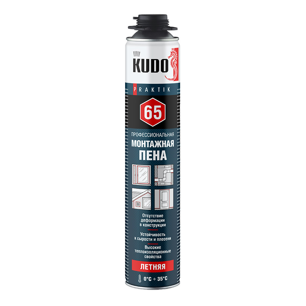Высококачественная однокомпонентная полиуретановая летняя монтажная пена Kudo Praktik 65+ обладает высокой адгезией к большинству строительных материалов, таких как — бетон, кирпич, штукатурка, дерево, пластик, за исключением полиэтилена, полипропилена и фторопласта. Обеспечивает равномерный, стабильный выход и идеальную мелкопористую структуру готовой пены.