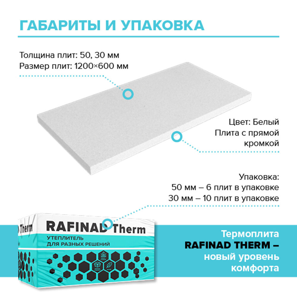 Термоплита Rafinad Therm представляет собой теплоизоляционные плиты из пенополистирола полученного экструзионным способом с гладкой поверхностью плит. Плиты производятся с прямой кромкой.