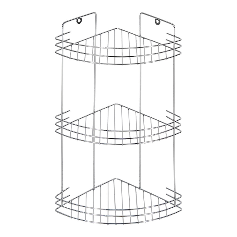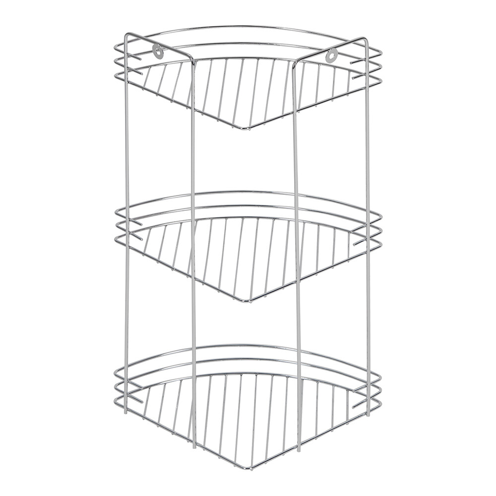 Полка металлическая, настенная, угловая, 3-х ярусная. Выполнена в цвете хром. Покрытие устойчиво к коррозии. Монтируется к стене при помощи крепления, входящего в комплект. Так же имеются металлические ножки (не оснащенные силиконовыми заглушками), что позволяет поместить данную полку на любой плоской поверхности. Расстояние от угла до крепления 11,5 см. Толщина прутьев – 0,32 см; 0,3 см; 0,19 см. Высота борта 3,5 см. Максимальная нагрузка 4,5 кг.