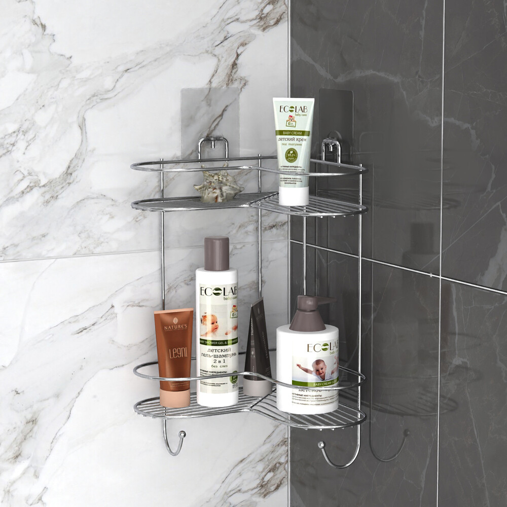 Двухъярусная угловая полка «Kleber Lite» имеет необычный дизайн в форме уголка с плавными круглыми краями. Хромированный металл отличается повышенной устойчивостью к влаге, а значит на вашей полке не появится ржавчина. Важной особенностью аксессуара является простота крепления. Специальные силиконовые пластины прочно фиксируют полку на стене, поэтому не нужно сверлить отверстия, чтобы установить ее в удобном месте.