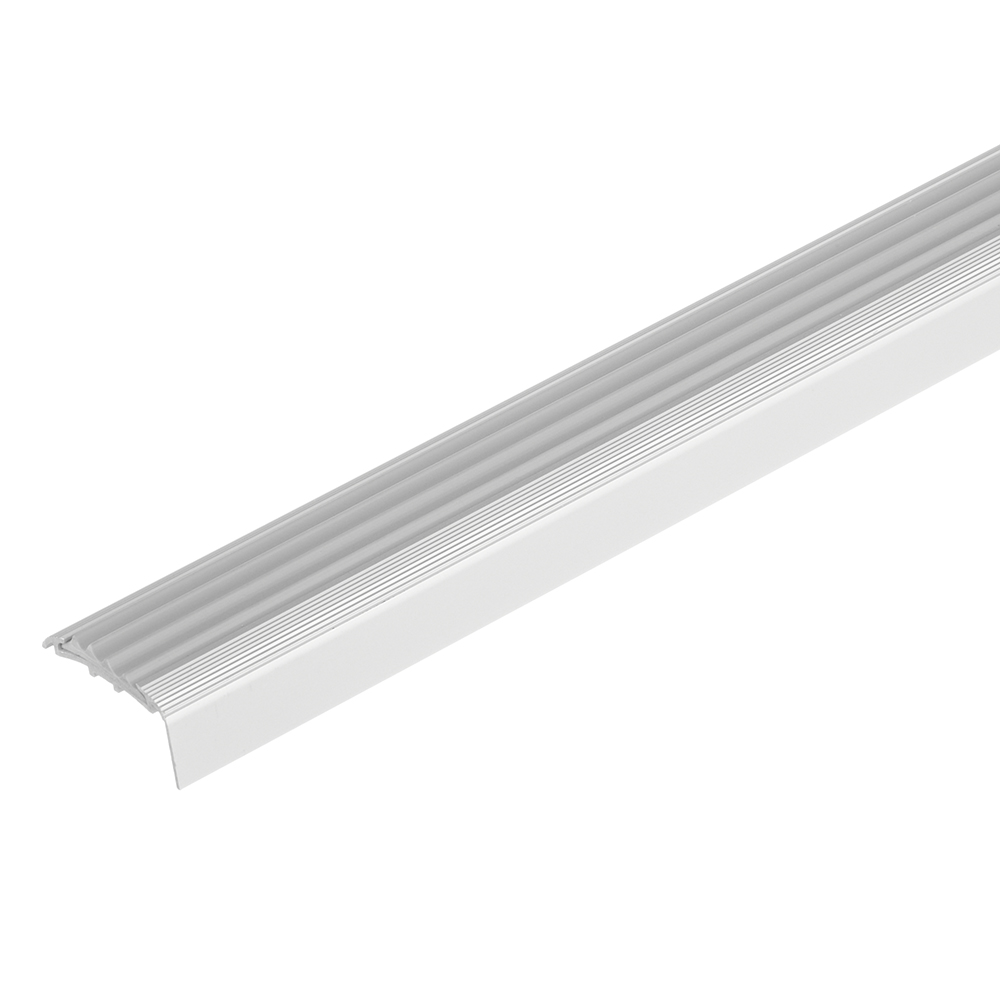 Угловой порог с ПВХ вставкой предназначен для защиты углов и ступеней лестницы Рифленая ПВХ-накладка в сочетании с алюминиевой основой предохраняет от скольжения, а также выполняет функцию грязезащиты при входе в помещение.