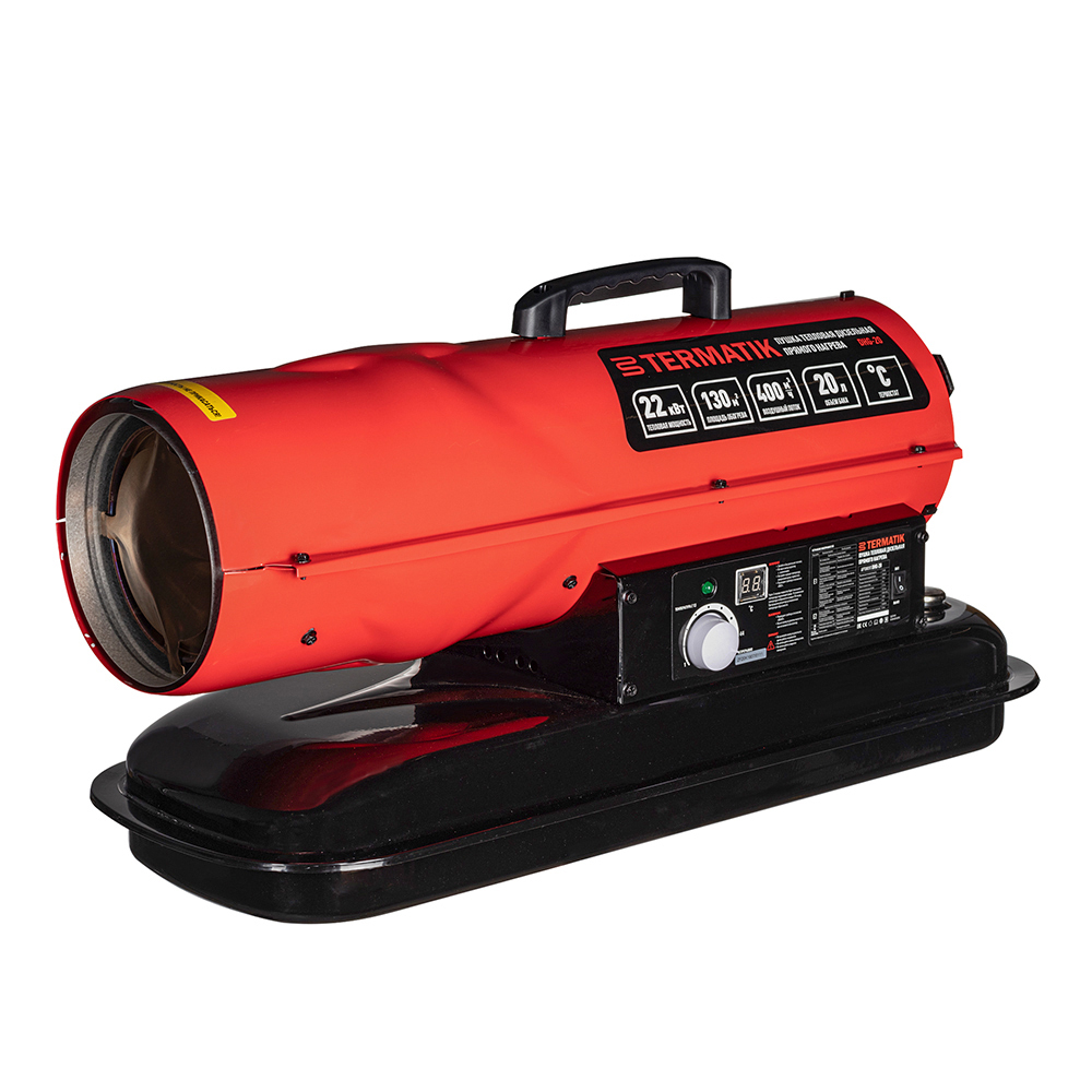 Тепловая дизельная пушка Termatik DHG-20 предназначена для обогрева и просушки воздуха или поверхностей на крупных строительных объектах, складских помещений, цехов и других помещений площадью до 130 м2, в условиях, исключающих попадание на него капель, брызг, а также атмосферных осадков. Данная тепловая пушка прямого нагрева работает на дизельном топливе и и предназначена только для промышленного использования. Пушка оснащена термостатом для работы в автономном режиме с поддержанием заданной температуры. На корпусе тепловой пушки находится регулятор термостата и цифровое табло температуры. Пушка имеет защиту от перегрева, систему контроля пламени и систему электрозащиты.