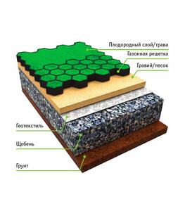 Газонная решетка имеет ячеистую структуру, где развивается корневая система травы. Ребра жесткости газонной решетки принимают на себя нагрузку от колес автомобиля и не дают образоваться колее, препятствуют вытаптыванию газона, сохраняя в ячейке условия для роста травы.
