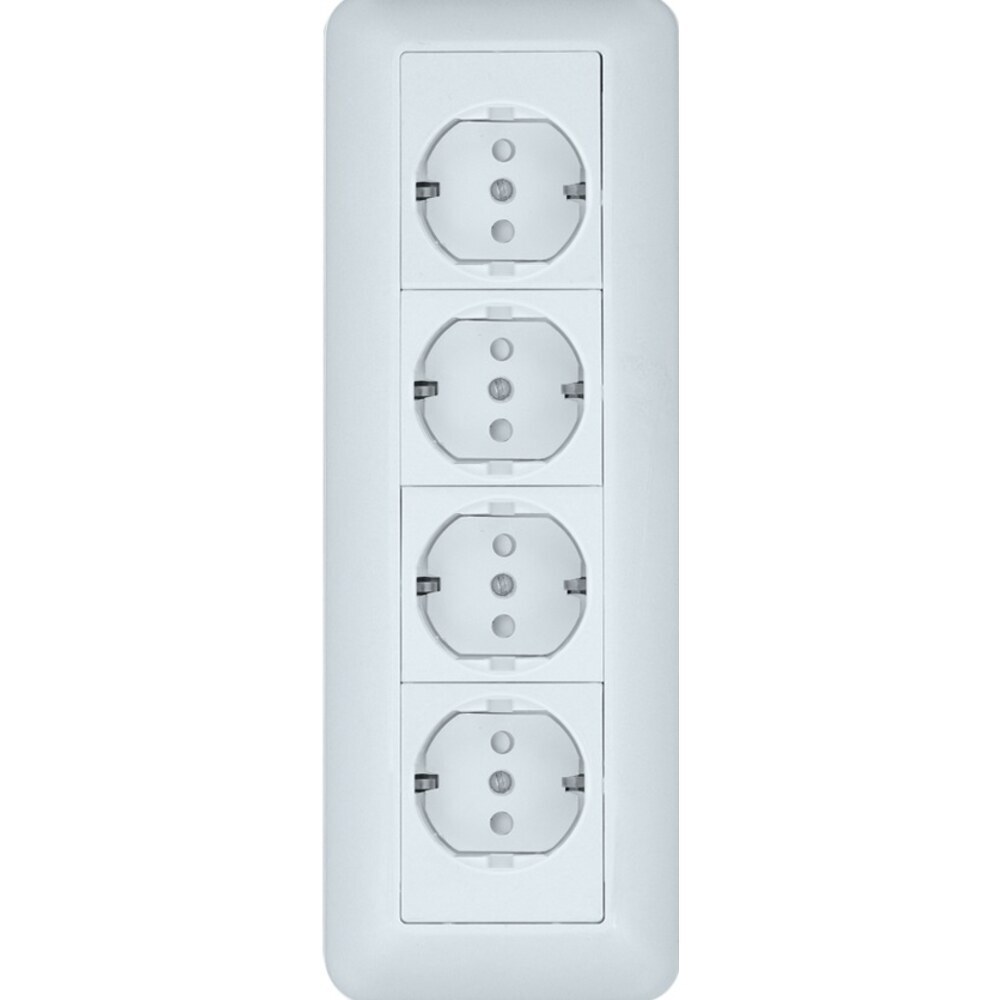 Розетка четырехместная Systeme Electric (ранее Schneider Electric) Blanca (открытой установки, цвет белый) с заземлением и со шторками, с монтажной стальной пластиной предназначена для сетей до 250 В на ток до 16 А.