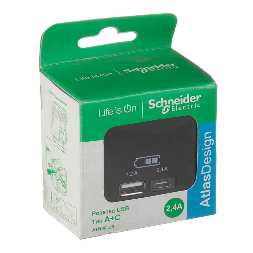 Розетка USB Systeme Electric AtlasDesign встраиваемая карбон USB-A/ Type-C (ATN001039)