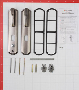 В комплекте поставки: 2 ручки на планке, уплотняющие прокладки под ручки, квадрат, защитная накладка на цилиндр, стяжные винты для крепления ручек.