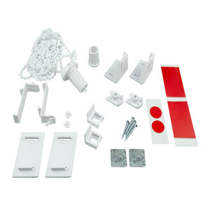Комплектация: Алюминиевая труба с тканью — 1 шт.; Механизм с цепочкой — 1 шт.; Упорный валик — 1 шт.; Боковые кронштейны — 2 шт.; Навесные кронштейны с регулировкой под толщину оконного профиля — 2 шт.; Монтажные площадки для крепления на «глухую» створку — 2 шт.; Двусторонний скотч — 2 шт.; Отвесная планка с магнитами для фиксации нижнего края шторы к раме — 1 шт.; Крепежный комплект — 1 шт.; Фиксатор — 2 шт.; Ограничитель размотки ткани — 2 шт.