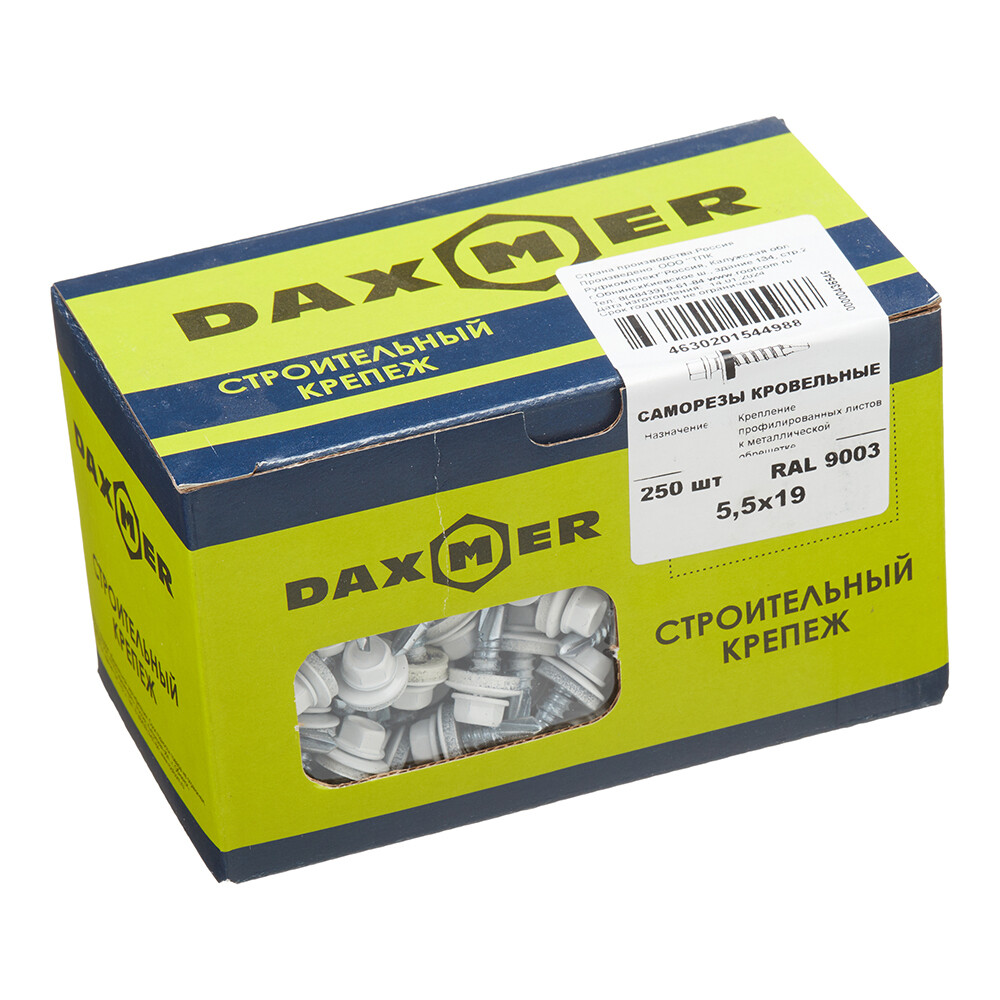 Саморезы кровельные с шестигранной головкой, шайбой с резиновой уплотняющей прокладкой и сверлом, на конце, позволяющим осуществлять монтаж без предварительного засверливания т.м. Саморезы Daxmer предназначены для крепления листов металлочерепицы и комплектующих, а также профнастила, к металлическому каркасу и маркируется символом «М».