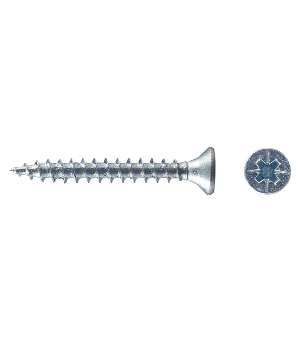 Саморезы имеют потайную головку с крестообразным шлицем PZ 1 и острый наконечник. Производятся из оцинкованной стали.