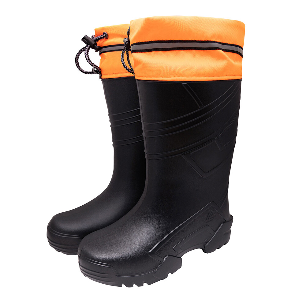 Рабочие сапоги мужские модели Викинг выполнены в черном цвете с оранжевой кулиской с утягивающим шнурком, регулируемым цилиндром. На кулиске светоотражающая полоса. Верх и подошва сделаны из материала ЭВА. Литьевой метод крепления. Надставка из водоотталкивающей ткани и вкладыш из фольгированного полотна.