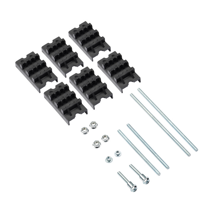 Предназначен для создания требуемую конфигурацию шинодержателя в зависимости от требований проекта. Основанием служит прочный алюминиевый перфорированный профиль, на который насаживаются изоляторы для установки силовых шин ребром. Изоляторы имеют различное исполнение, обеспечивающее возможность установки шин толщиной 5 и 10 мм в количестве от 2-х до 4-х на одну фазу. В составе комплектов идет необходимый крепеж — гайки, шпильки, винты.