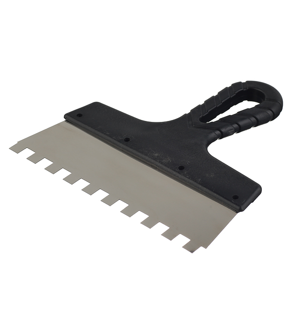 Предназначен для нанесения и распределения клеевых растворов и создания на их поверхности гребенчатой структуры при укладке керамической плитки, декоративного камня и др. Шпатель зубчатый служит для того, чтобы клеевая масса разравнивалась до одинаковой толщины слоя по всей площади материала без образования пустот.