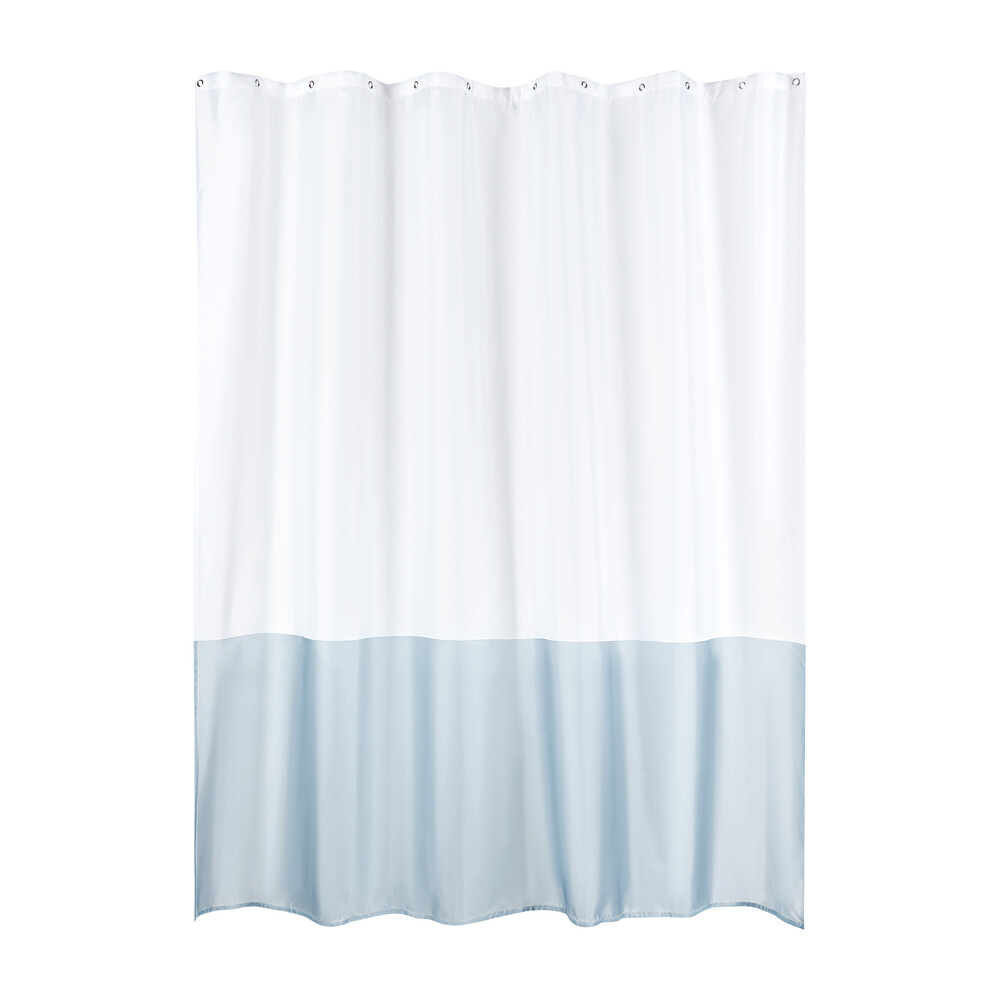 Тканевая штора для ванной комнаты Teriberka из полиэстера бело-голубого цвета. Размер шторки — 180х180 см. Обладает водоотталкивающим покрытием, которое не пропускает воду. Утяжеляющий нижний кант не дает шторе прилипать к телу, а также раздуваться от напора воды. В качестве крепления на карниз используются люверсы. Кольца приобретаются отдельно.