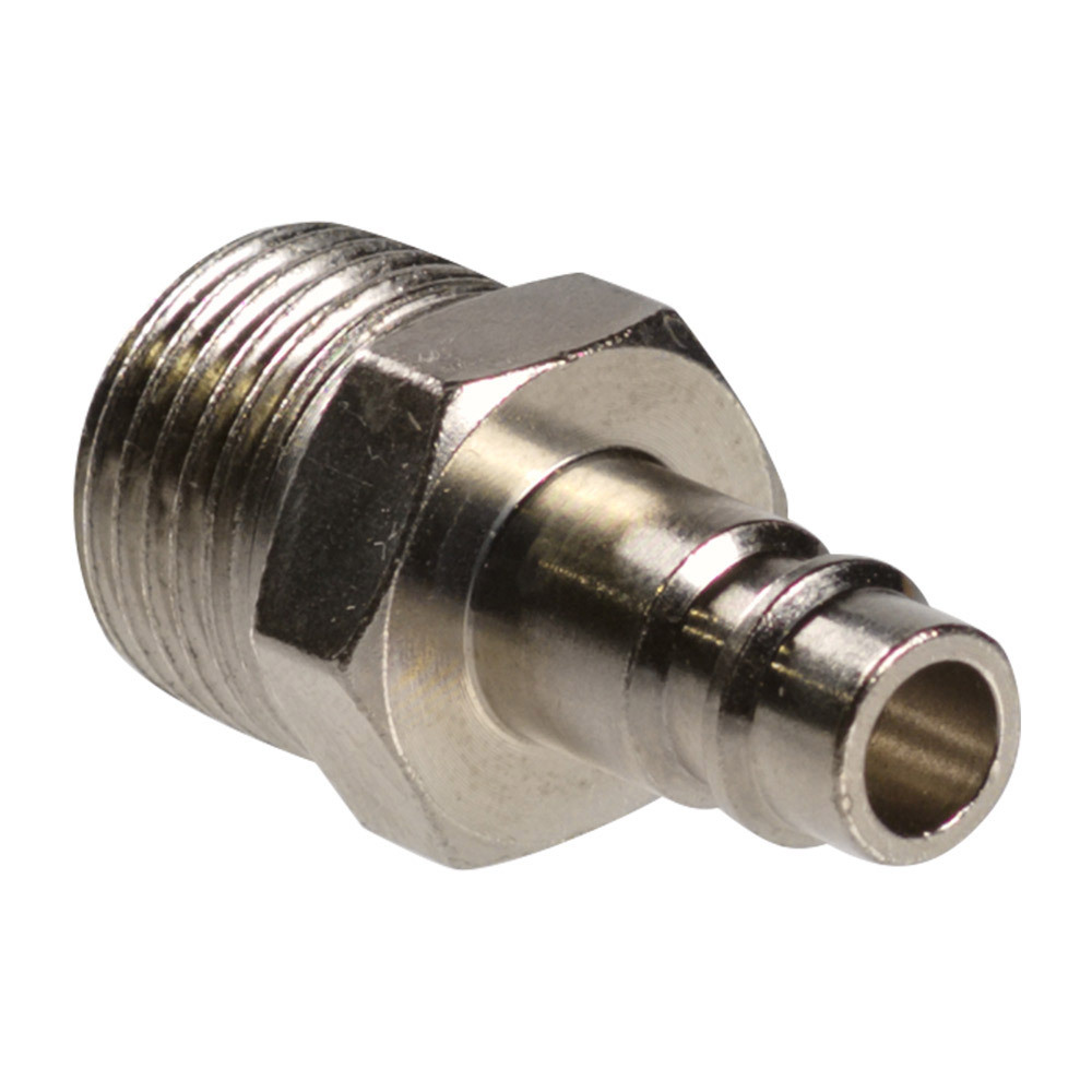 Переходник Fubag 180142 B применяется для соединения различных частей пневмосистем. С одной стороны фитинг имеет внешнюю резьбу — 1/2″, с другой быстросъемное соединение — рапид штуцер.