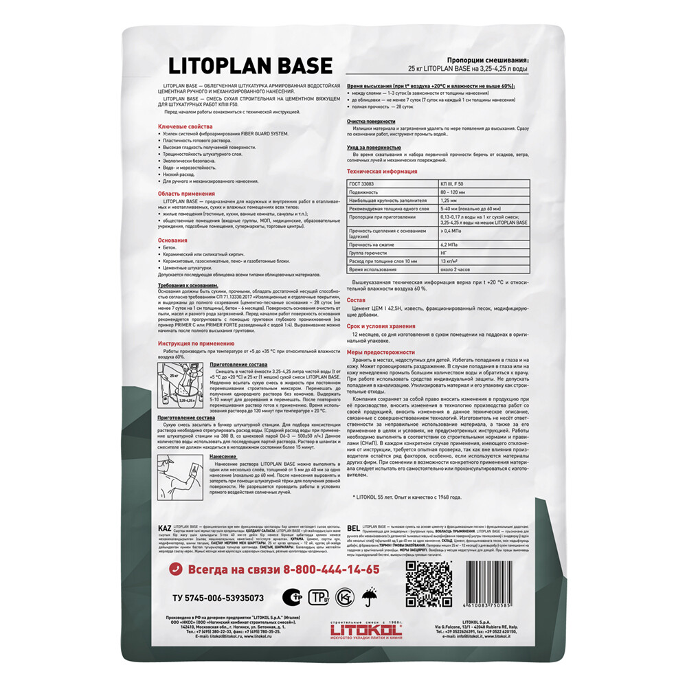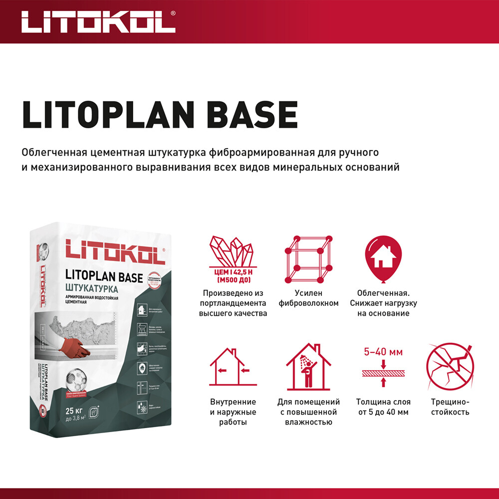 Штукатурка цементная Litokol Litoplan Base водостойкая армированная 25 кг