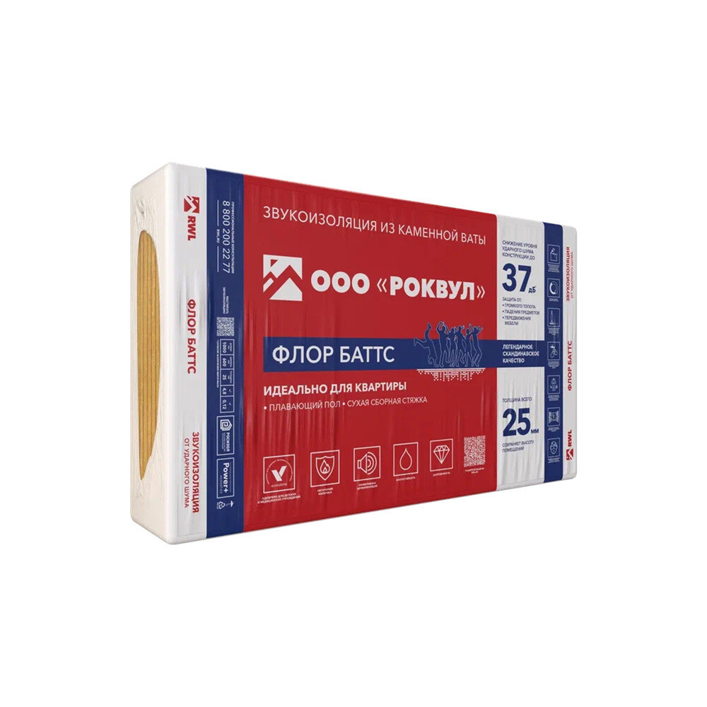 ФЛОР БАТТС 25 мм это один из самых тонких звукоизоляционных материалов из каменной ваты, используемых в строительстве. Позволит сохранить высоту помещения.