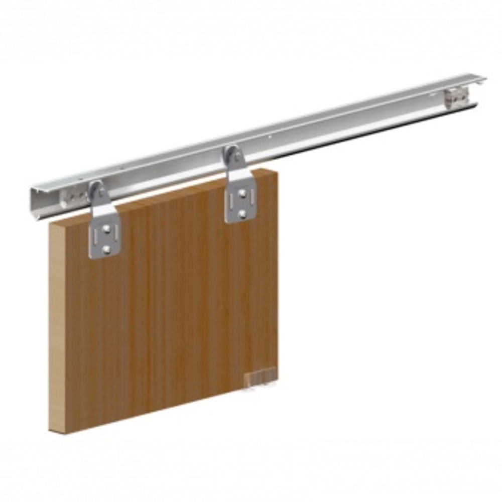 Данную систему можно использовать для монтажа двери с шириной полотна от 600 до 750 мм и весом одной створки до 45 кг. С помощью стопора можно регулировать уровень открывания двери, а отсутствие нижней направляющей не портит эстетичный вид двери и всего помещения в целом.