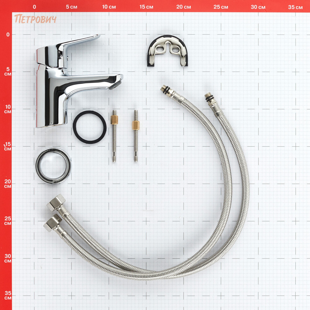 Смеситель, монтажный набор, гибкая подводка, инструкция по эксплуатации с гарантийным талоном.