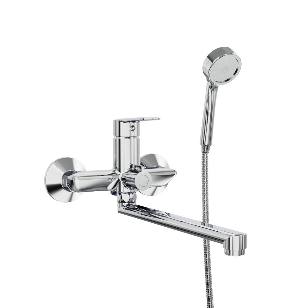 Смеситель для ванной с длинным изливом Tokito — хромирована гальваническим способом, о чём свидетельствует зеркально серебристый внешний вид крана. Благодаря длинному поворотному гусаку, вынос сливной форсунки отверстия над ванной относительно стены составляет 34,4 см. Излив свободно вращается в обе стороны. Ширина прибора равна 18 см. В корпус ввинчивается шланг длиной 1,5 м с душевой лейкой. Между ручками расположен штырковый переключатель подачи воды в гусак или душевой шланг.