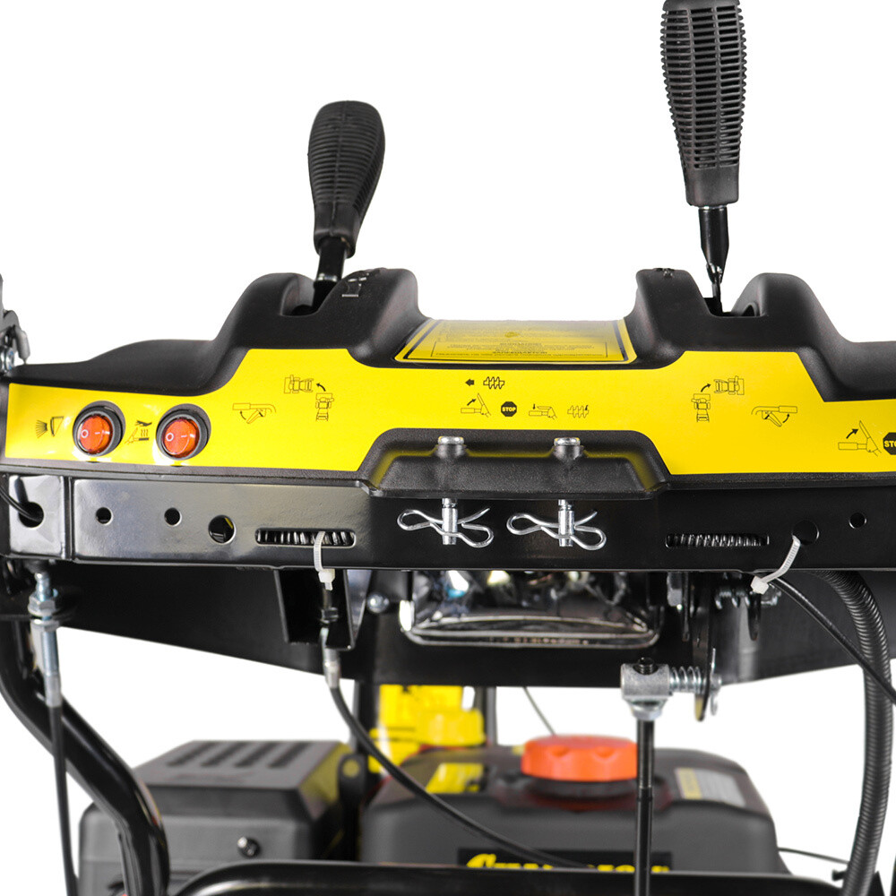 Снегоуборщик оборудован всеми необходимыми для частого использования функциями. Для работы в темное время суток, снегоуборщик оборудован галогеновой фарой, а для упрощения запуска при экстремально низких температурах – электростартером, позволяющим запустить мотор нажатием одной кнопки от сети 220 Вольт.