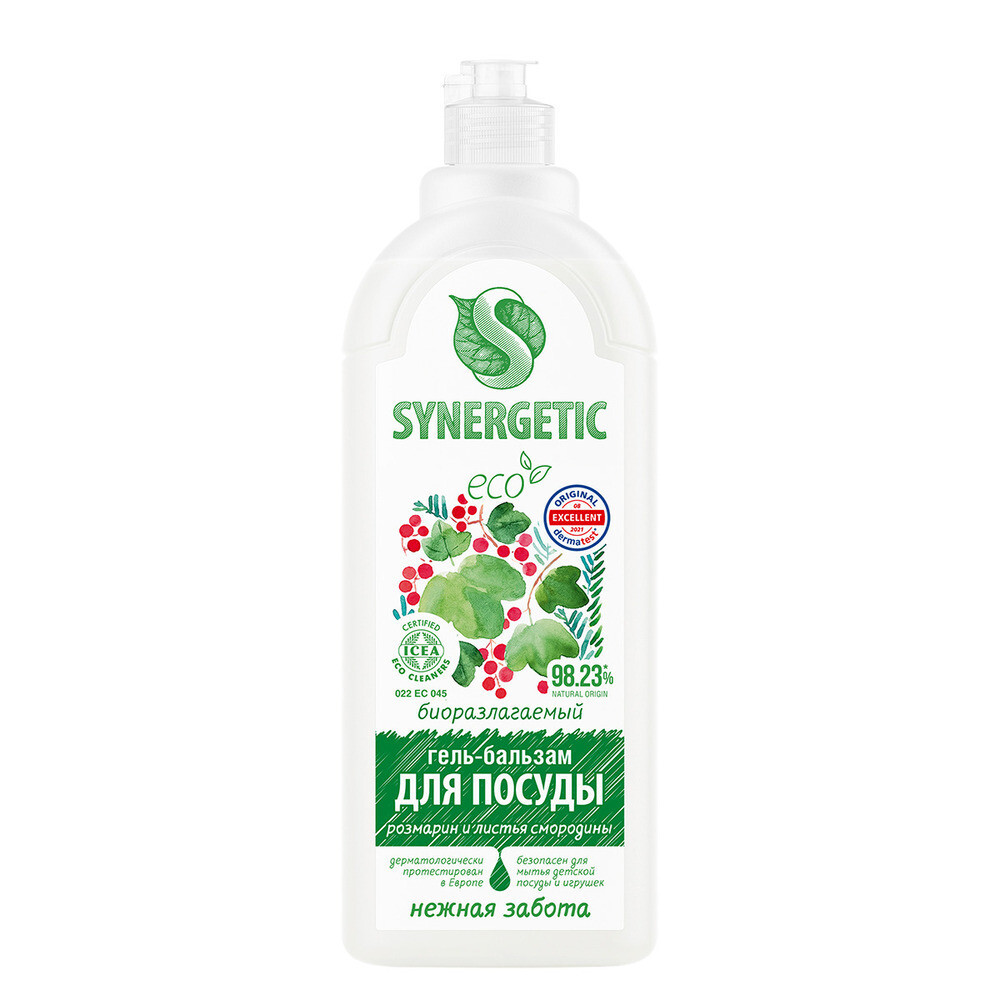 Биоразлагаемый гель-бальзам для мытья посуды и детских игрушек Synergetic «Розмарин и листья смородины» — это экологичное, безопасное и эффективное средство для мытья всех видов посуды, в том числе детской, кухонного инвентаря и детских игрушек от любых видов загрязнений. Легко смывается водой и не оставляет следов на посуде. Содержит ухаживающие компоненты для увлажнения кожи рук. Комплекс биоразлагаемых ПАВ из растительного масла и энзимов эффективно удаляет жир и сложные загрязнения даже в холодной воде, придавая посуде зеркальный блеск. Нейтрализует неприятные запахи. Экстракты ламинарии и спирулины питают и увлажняют кожу рук, делая ее более мягкой, повышая эластичность. Эффективность средства подтверждена в Германии. Гипоаллергенная парфюмерная композиция с эфирными маслами эвкалипта, апельсина и пачули придает средству нежный и приятный аромат. Международный экологический сертификат ICEA подтверждает биоразлагаемость, безопасность и эффективность средства. Подходит для чувствительной кожи. Дерматологически протестирован независимым институтом Dermatest в Германии. Биоразлагаемые компоненты не вредят микрофлоре септических установок при использовании средства в соответствии со способом применения.