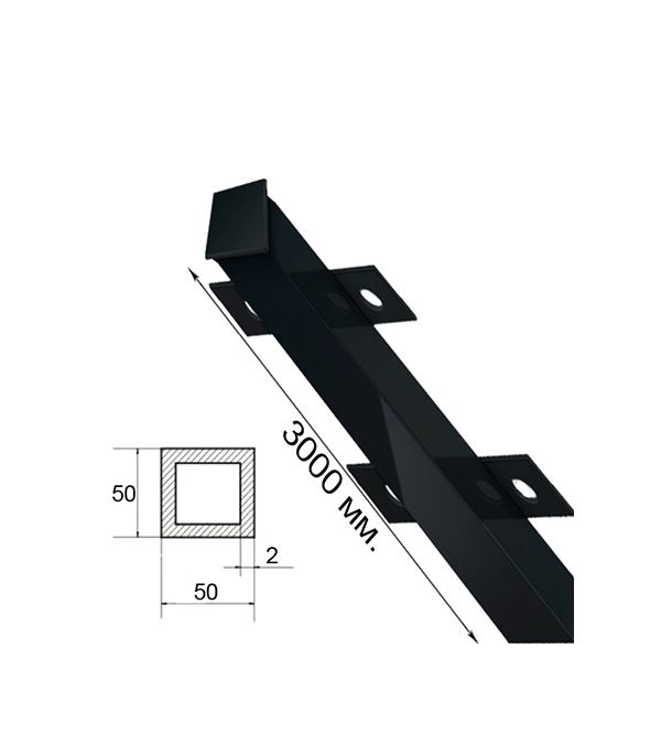 Столб для забора усиленный 50х50х2 мм 3 м с планками грунт черный