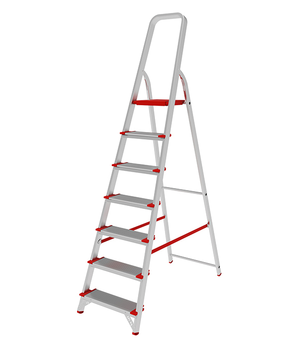 В основании стремянки прочная рама из алюминиевого профиля прямоугольного сечения. Пластиковые наконечники препятствуют скольжению, и обеспечивают отличную устойчивость. Многократное клепаное соединение ступеней с рамой обеспечивает исключительную надежность и безопасность при работе на стремянке. Имеет семь ступеней шириной 130 мм, что позволяет стопе комфортно размещаться на лестнице.