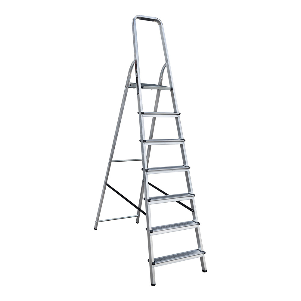 Предназначена для бытового использования. Стойки и ступени изготовлены из алюминиевого профиля. Рифлёные ступени для надёжного сцепления, имеющие размер 80 мм (евростандарт). Заклёпочное крепление ступеней обеспечивает высокую статическую и динамическую прочность, а закруглённые безопасные края ступеней и площадки смягчают контакт с голенью, предотвращают травмы. Пластиковые повторяющие рельеф заглушки ступеней с длительным сроком службы скрывают острые кромки. Рабочая площадка 260х260 мм из оцинкованной стали позволяет удобно размещать инвентарь. Высота площадки — 1,48 м, рабочая высота — 3,48 м. Упор площадки из стального прутка с фиксатором встаёт точно в пазы и предотвращает повреждение пальцев. Усиленное крепление стоек заднего каркаса с развальцовкой повышает устойчивость стремянки, а страховочные погодоустойчивые ремни на заклёпках с увеличенной шляпкой создают жёсткую конструкцию, не гниют и не выгорают. Дуга безопасности 600 мм обеспечивает надёжную точку опоры на высоте. Башмаки из прочного пластика не скользят и не повреждают поверхность. Стремянка компактно складывается для хранения и транспортировки, в сложенном состоянии занимает мало места.